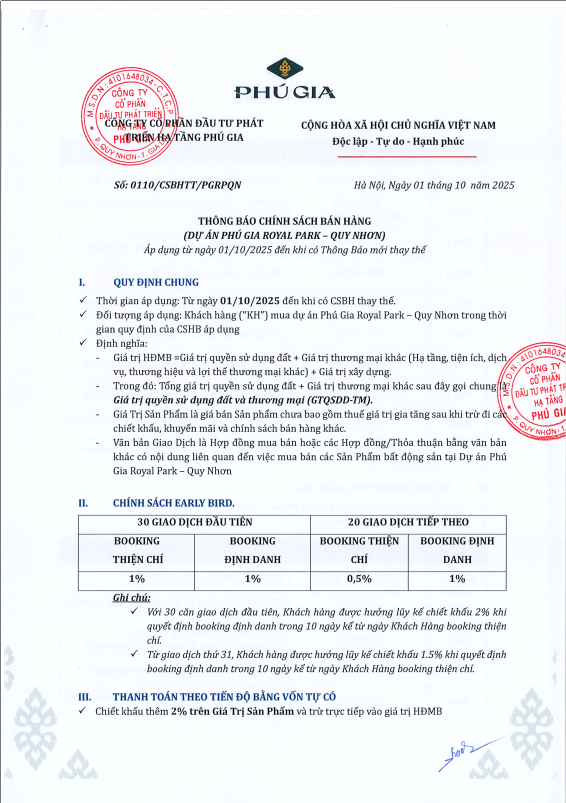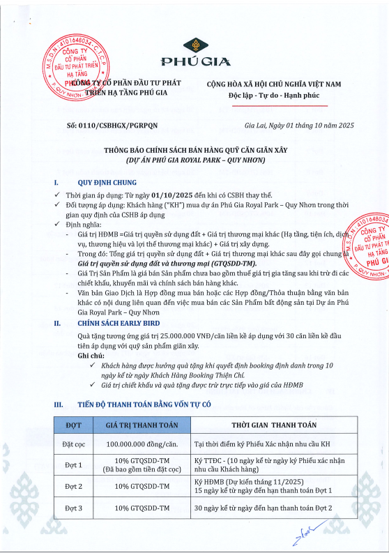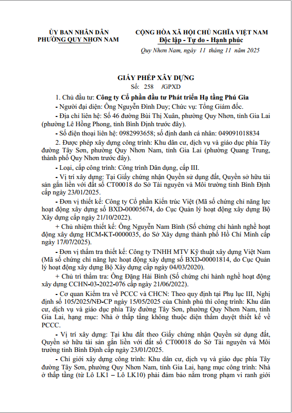 Giới thiệu dự án Phú Gia Royal Park – Quy Nhơn Quy Nhơn – đô thị biển năng động, đang vươn mình trở thành trung tâm kinh tế và du lịch hàng đầu miền Trung. Ngay tại trục đường chiến lược 354 Tây Sơn, dự án Phú Gia Royal Park xuất hiện như một dấu ấn mới, kiến tạo nên một không gian sống hiện đại, đồng bộ và đầy đủ tiện ích. Vị trí đắc địa: Phú Gia Royal Park tọa lạc tại khu đất trước kia thuộc Trung tâm Đào tạo nghiệp vụ Giao thông Vận tải Bình Định, phường Quy Nhơn Nam, tỉnh Gia Lai. Với quy mô lên tới 6,3ha, dự án hứa hẹn trở thành một khu đô thị kiểu mẫu, đáp ứng nhu cầu an cư và đầu tư của khách hàng. Quy mô và thiết kế: - 283 căn nhà phố liền kề được xây dựng đồng bộ, kiến trúc hiện đại. - Cao 4 tầng + 1 tum và 4 tầng +1 lửng + 1 tum; diện tích linh hoạt từ 67m² đến 144m². - Hoàn thiện mặt ngoài, bàn giao thô bên trong, cho phép gia chủ thoải mái sáng tạo không gian sống theo phong cách riêng. Tiện ích đa dạng: dự án mang đến hệ thống tiện ích toàn diện: - Trung tâm thương mại – quảng trường sầm uất. - Bể bơi, sân thể thao pickleball, vườn dạo bộ phục vụ nhu cầu rèn luyện và thư giãn. - Trường học liên cấp 4.000m², đảm bảo môi trường học tập chất lượng ngay trong khuôn viên. Chủ đầu tư và tiến độ thi công: Dự án được phát triển bởi công ty Cổ phần Đầu tư Phát triển Hạ tầng Phú Gia – đơn vị uy tín trong lĩnh vực bất động sản. Hiện nay, Phú Gia Royal Park đang được khẩn trương triển khai hạ tầng kỹ thuật, từng bước hình thành diện mạo của một khu đô thị đáng sống ngay giữa lòng Quy Nhơn. Địa chỉ dự án: 354 Tây Sơn, Quy Nhơn Nam, Gia Lai. ![]()