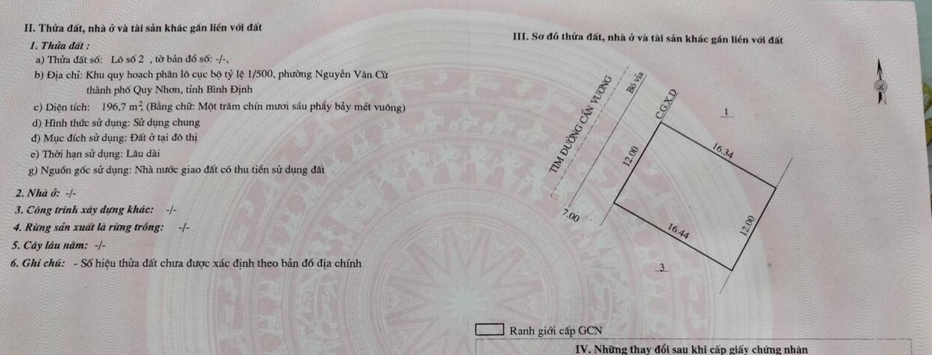 Công ty Dovehome chúng tôi trân trọng giới thiệu đến quý khách hàng cơ hội sở hữu một bất động sản vàng ngay tại trung tâm TP Quy Nhơn, với vị trí mặt tiền đường Cần Vương, chỉ cách biển 600m. Đây là một trong những khu vực phát triển nhanh và sôi động nhất thành phố, hứa hẹn mang lại giá trị đầu tư cao trong tương lai. ♦ Thông tin chi tiết về bất động sản: - Diện tích: 196,7m2 (12m x 16,4m) - Hướng: Tây Bắc - Lộ giới: 14m - Kết cấu: 4 tầng + sân thượng + Tầng trệt: Mặt bằng kinh doanh rộng lớn + Tầng 1,2,3: 8 phòng ngủ (bao gồm 1 phòng master có thể làm phòng kinh doanh); phù hợp cho thuê hoặc kinh doanh lưu trú + Khác: 2 bếp, phòng thờ rộng rãi, 10 WC, sân thượng thoáng mát ♦ Tiềm năng sử dụng: Hiện căn nhà đang được sử dụng để ở kết hợp kinh doanh dịch vụ cafe, ăn sáng và cho thuê trọ. Tuy nhiên, với diện tích rộng lớn cùng vị trí đắc địa, lô đất này chưa được khai thác tối ưu. Chủ nhân mới có thể thực hiện các phương án đầu tư sau: - Xây dựng tòa nhà tổ hợp 11 tầng: Kinh doanh nhà hàng, khách sạn, dịch vụ massage, mang lại nguồn thu nhập ổn định và lâu dài. - Xây dựng tòa nhà văn phòng: Dành cho các tập đoàn lớn hoặc cho thuê văn phòng, đáp ứng nhu cầu ngày càng tăng về không gian làm việc hiện đại tại Quy Nhơn. - Sử dụng để ở kết hợp kinh doanh: Phát triển theo mô hình hiện hữu hoặc tùy biến theo nhu cầu riêng của chủ sở hữu mới. ♦ Ưu điểm nổi bật: - Vị trí đắc địa: Mặt tiền trung tâm Quy Nhơn, cách biển chỉ 600m, thuận tiện di chuyển và kinh doanh. - Diện tích rộng lớn: Lên đến gần 200m2, mặt tiền 12m, hiếm có tại khu vực trung tâm thành phố. - Giá trị đầu tư cao: Giá bán chỉ 24 tỷ, còn thương lượng. Đây là mức giá hợp lý cho một bất động sản tiềm năng tại Quy Nhơn. Đây là cơ hội không nên bỏ lỡ dành cho các nhà đầu tư thông thái và những ai đang tìm kiếm một nơi an cư kết hợp kinh doanh lý tưởng. Hãy liên hệ với công ty Dovehome chúng tôi ngay hôm nay để được tư vấn chi tiết và sở hữu ngay lô đất vàng này! | |