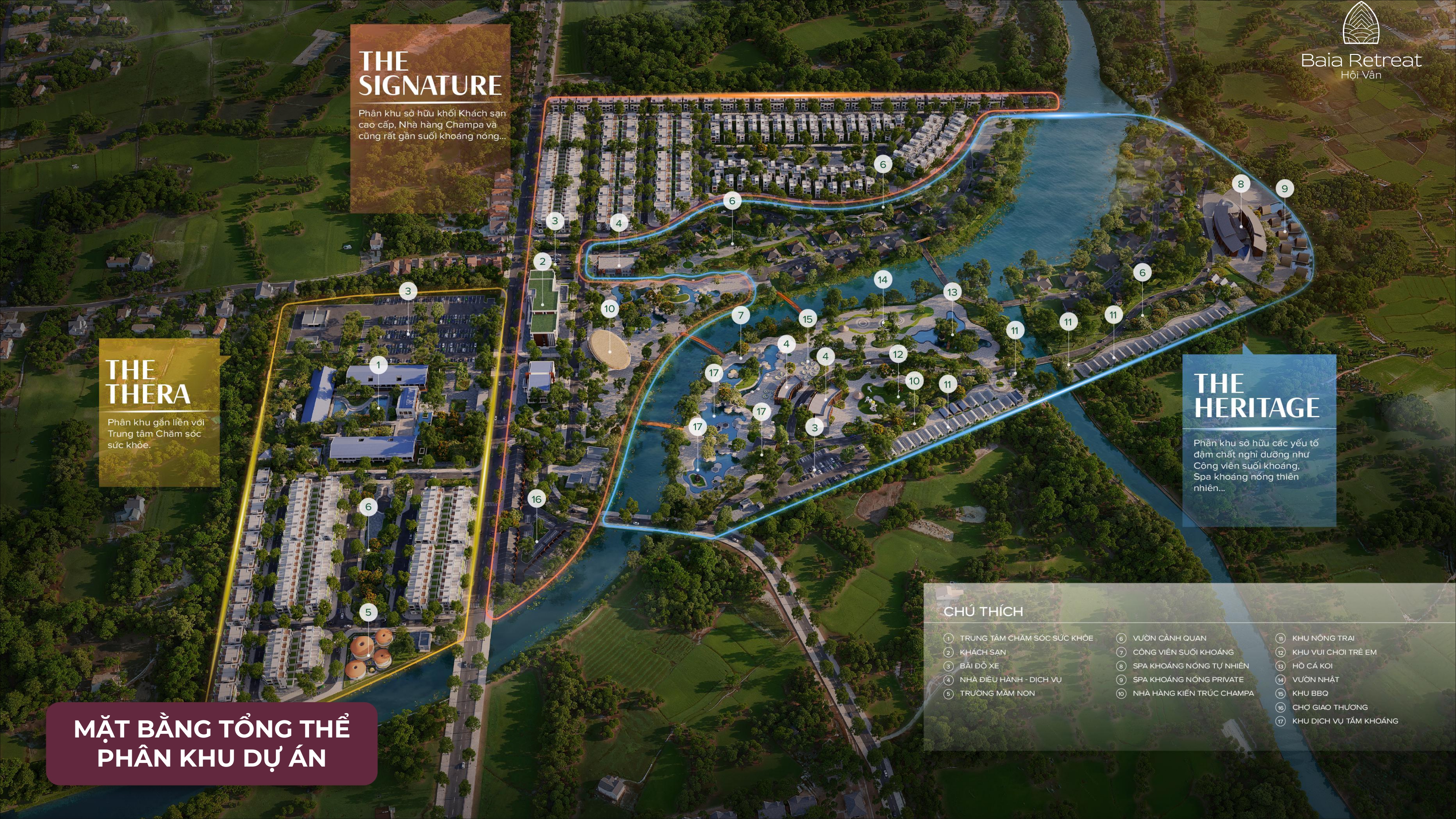 Quy mô: 42ha với mạch suối khoáng nóng tự nhiên Hội Vân phát lộ tại trung tâm dự án. Sản phẩm (371 sản phẩm) 143 sản phẩm liền kề 156 sản phẩm song lập 72 sản phẩm biệt thự đơn lập 3 phân khu: - The Thera: Gắn với trung tâm chăm sóc sức khoẻ. - The Signature: Các căn Villa đẳng cấp chỉ 1 bước chân đến suối khoáng nóng. - The Heritage: Tổ hợp tiện ích công viên khoáng nóng, khách sạn,… | |