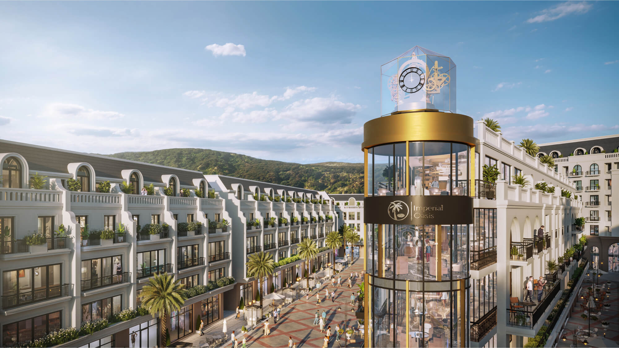 Từng chi tiết được thiết kế tỉ mỉ để nâng tầm mọi trải nghiệm, trở thành sự lựa chọn hoàn hảo cho những cuộc thương thảo triệu đô, không gian thưởng lãm nghệ thuật đẳng cấp cùng thế giới lễ hội giải trí đa sắc màu sẽ thắp sáng kỷ nguyên thịnh vượng tại Imperial Oasis Quy Nhơn. 01 Tháp đồng hồ (Imperial Oasis Tower) 02 Tháp vọng cảnh (Billion View Tower) 03 Đường chạy trên mái (Panorama Skyway) 04 Cầu đi bộ (Golden Silk) 05 Lối vào nhà kính (Glass Museum) 06a Phố Đông đi bộ 06b Phố Tây đi bộ 07 Ngọn đuốc san hô (Bloom Tower)