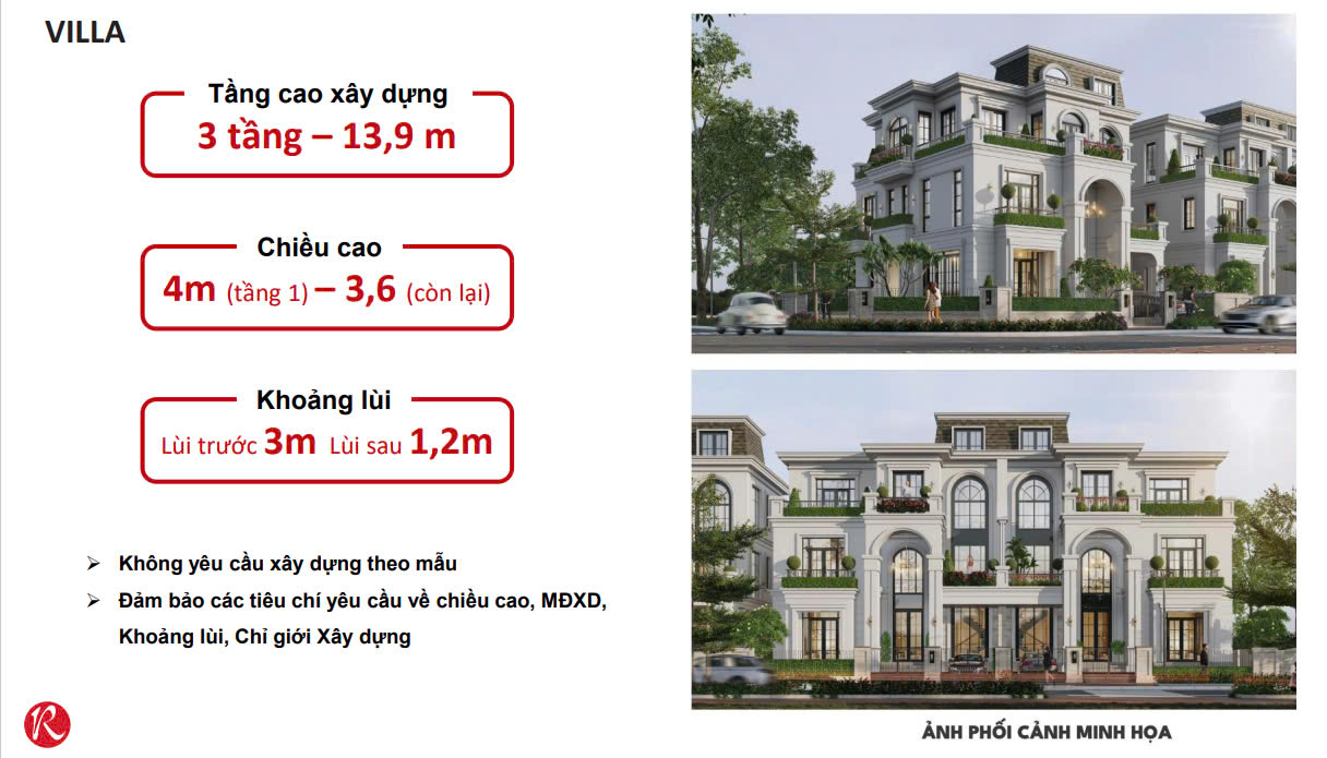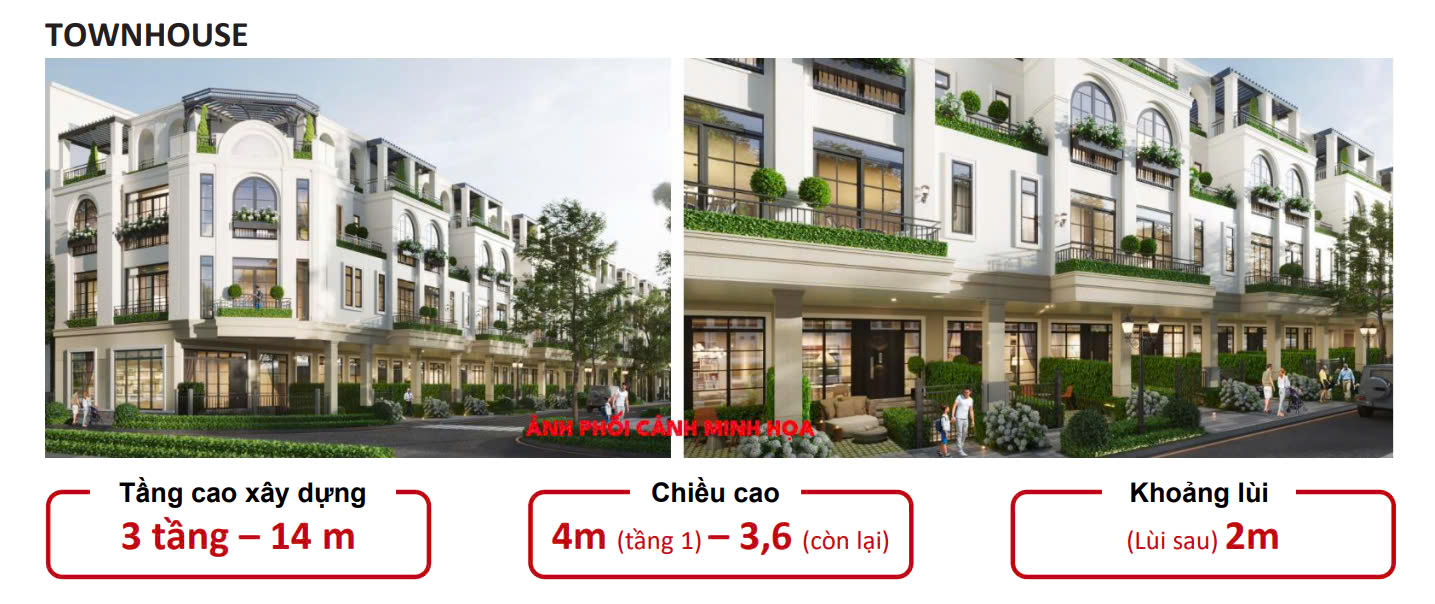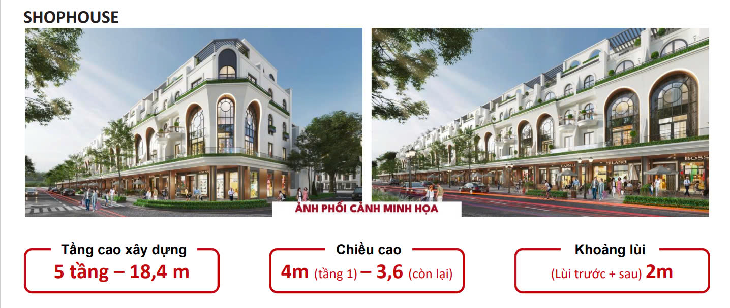 | Loại sản phẩm | Đất nền LK (4 tầng; lùi sau 2m), shophouse (4 tầng; lùi trước và sau 2m), biệt thự (4 tầng; lùi trước 3m; lùi sau 1,2m) |