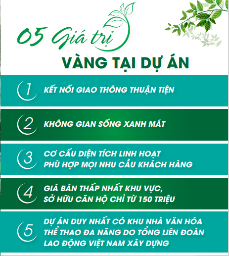 Các Tiện ích nội khu đa dạng như : Sân bóng , nhà văn hóa thể thao công đoàn , quảng trường , phòng khám , nhà trẻ , siêu thị... Ngân hàng chính sách hỗ trợ vay tới tối đa 80% giá trị căn hộ. Lãi xuất 4,8%/ năm, vay tối đa 25 năm.