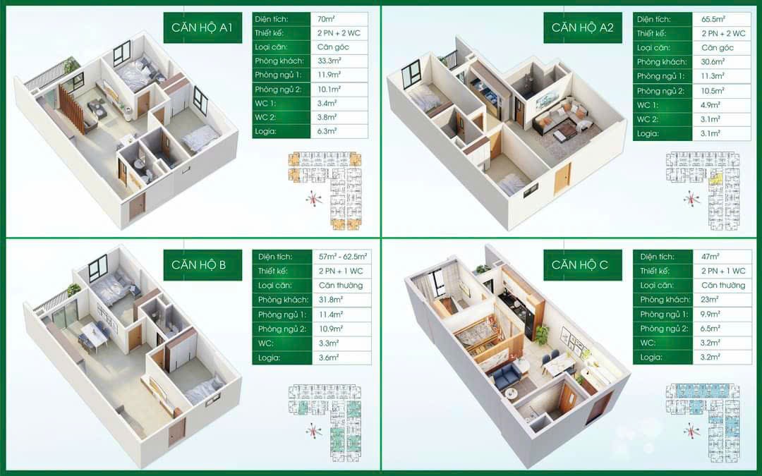 | Diện tích sản phẩm | 2PN (47m2 - 57m2 - 62m2 - 70m2) |