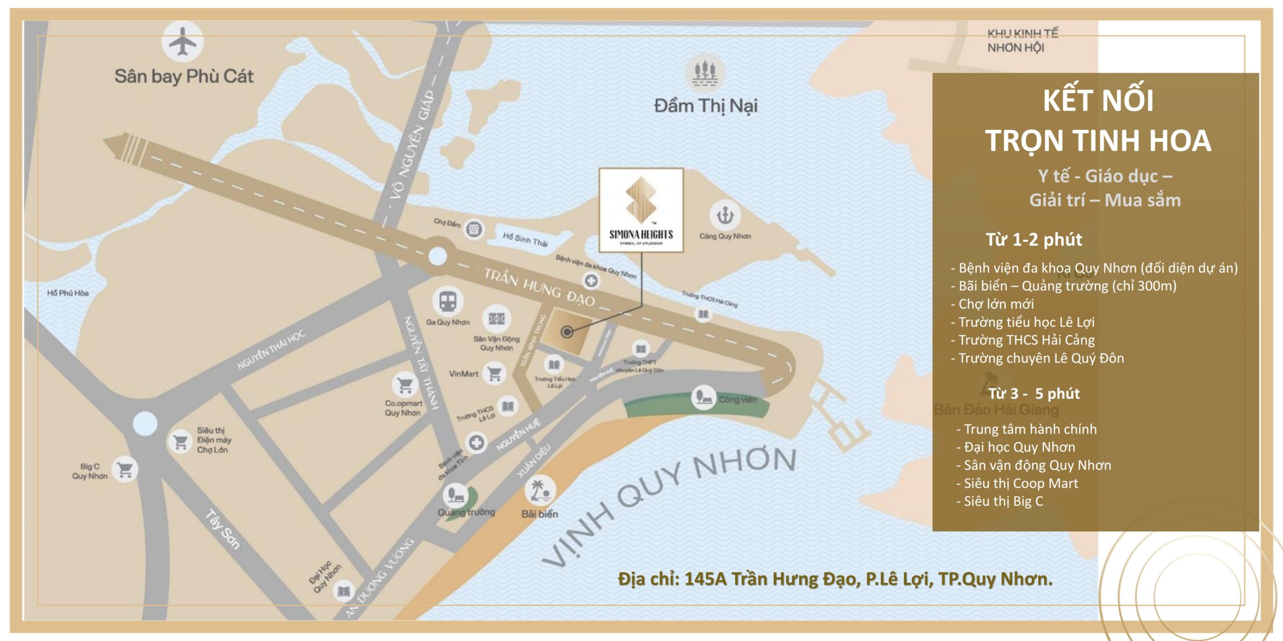 3– Vị trí đắc địa nằm trên 2 mặt tiền đường lớn của Quy Nhơn, đối diện bệnh viện thành phố, cách biển 300m, bán kính 1km đầy đủ Trường học, bệnh viện chợ, siêu thị, khu vui chơi, trung tâm hành chính…Mật độ xây dựng chỉ 44.86%, cùng với hơn 50 tiện ích đặc quyền, quản lý vận hành 5*--> Vị trí đắc địa, một bước chân ngàn tiện ích. Căn hộ Simona Heights mang lại một không gian nghỉ dưỡng kết hợp để ở với những trải nghiệm tuyệt vời cho cư dân.