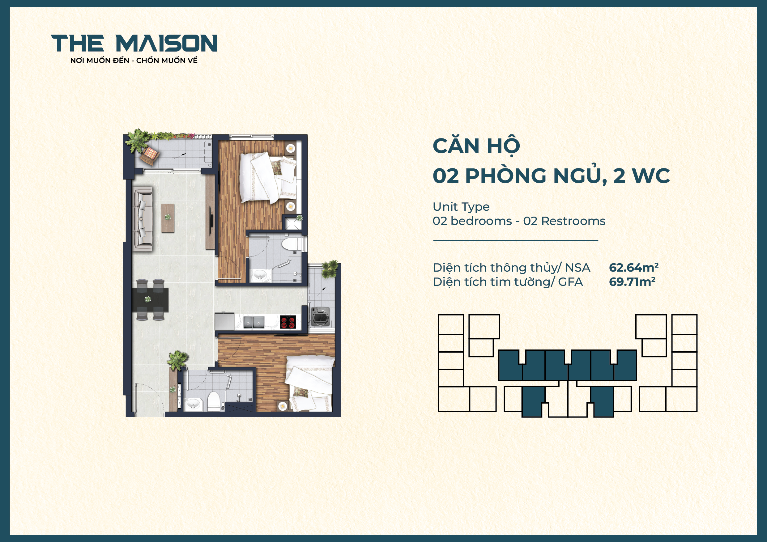 GIỚI THIỆU VỀ THE MAISON The Maison là căn hộ chung cư tọa lạc tại địa chỉ số 70 Phan Bội Châu, phường Phú Thọ, TP Thủ Dầu Một, Bình Dương. Chung cư The Maison có quy mô 5.607,4m2 với 2 block cao 29 tầng, gồm 632 căn hộ, do công ty C-Holdings làm chủ đầu tư. Với vị trí tọa lạc tại bên bờ sông Sài Gòn đắt giá, căn hộ The Maison thuộc phân khúc cao cấp này mang đến cho cư dân một tầm nhìn rộng mở và không gian sống yên tĩnh. Bên cạnh tiến độ xây dựng vượt trội (đã hoàn thành tầng 8 - tầng 14 tính đến ngày 9/6/2023) và pháp lý hoàn thiện, The Maison Bình Dương còn cung cấp cho cư dân các tiện nghi hiện đại như: hồ bơi vô cực trên tầng 5 với tầm nhìn ngắm nhìn sông Sài Gòn, phòng tập gym và yoga, khu vườn BBQ xanh mát, khu vui chơi cho trẻ em và nhiều tiện ích khác...