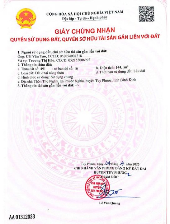 Dovehome chào bán lô đất thôn Thọ Nghĩa, Phước Nghĩa, Tuy Phước, Bình Định Diện tích: 144,1m2 (4,5 x 30,76; nở hậu 5m). Full thổ cư Hướng Bắc Lộ giới 3,5m, đường bê tông hiện hữu. Xe ô tô 7 chỗ chạy vào ra thoải mái Có sẵn nhà cấp 4 có thể ở tạm. Vị trí thoáng mát Gần trường tiểu học Thọ Nghĩa. Khu dân cư hiện hữu. Giao thông kết nối thuận lợi qua trục QL19 mới và các tuyến đường liên xã Lô đất rất phù hợp để ở, đầu tư hay làm của để dành sau này. Giá bán: 690 triệu Vui lòng liên hệ ngay Dovehome để nhanh chóng sở hữu "Dovehome - mang đến HẠNH PHÚC và THỊNH VƯỢNG" | |