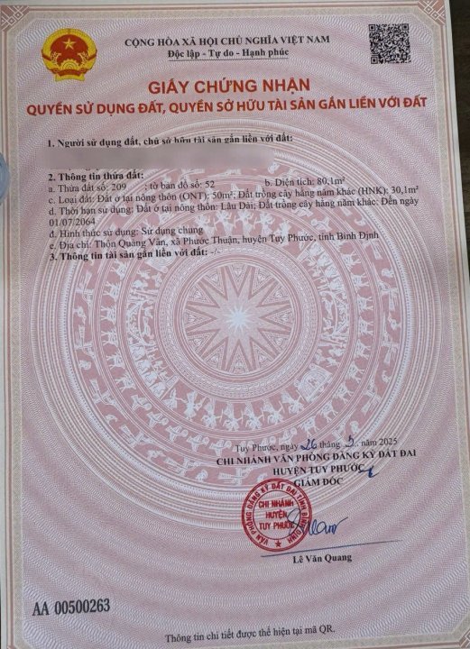 1. MÔ TẢ CHUNG: - Vị trí: Quảng Vân, Phước Thuận, Tuy Phước cũ (nay là xã Tuy Phước, tỉnh Gia Lai), tiếp giáp Quy Nhơn - Đường bê tông xe ô tô - Diện tích: 154m2 (7 x 21). Có 100m2 thổ cư - Hướng: Đông Bắc thông thoáng; đón được cả hướng Đông Nam, tận hưởng nắng ban mai giàu vượng khí. 2. LỢI THẾ: - Chỉ cách trục đường Điện Biên Phủ nối dài (kết nối sân bay Phù Cát – TP. Quy Nhơn) 250m: 1 lợi thế lớn cho tiềm năng tăng giá cao; cách QL19 mới chỉ 1,5km – giao thông cực kỳ thuận tiện, kết nối Bắc – Nam dễ dàng. - Vị trí gần trung tâm TP. Quy Nhơn, thuận lợi di chuyển và sinh sống, kinh doanh... - Cách sông Hà Thanh chỉ hơn 300m: rất thoáng mát và trong lành - Bên cạnh căn nhà là khu đất lớn được quy hoạch dân cư, nên sắp tới sẽ được chính quyền đầu tư hạ tầng, có thể tổ chức đấu giá và tái định cư.... Căn nhà sẽ càng được nâng cao giá trị. - Đặc biệt: xã Phước Thuận đã sáp nhập với các thị trấn và các xã lớn như: Tuy Phước, Diêu Trì, Phước Lộc, Phước Nghĩa để hình thành xã mới có tên xã TUY PHƯỚC, phát triển mạnh hơn. Chính quyền mới chắc hẳn sẽ đầu tư phát triển cho xã Tuy Phước mới rất nhiều... Tiềm năng tăng giá cực cao, đúng nghĩa “hổ mọc thêm cánh”! 3. NHƯỢC ĐIỂM: Đường bê tông ô tô hiện tại chỉ đủ 1 chiều cho 1 xe ô tô/tải qua lại 4. NHẬN ĐỊNH CHUNG: - Nhà cấp 4 vào ở ngay, phù hợp gia đình ra ở riêng và có tài chính không quá nhiều - Dự đoán sau này sẽ có đường kết nối với đường Điện Biên Phủ nối dài (sân bay Phù Cát - Quy Nhơn) thì giao thông càng thuận tiện và giá trị khu này tăng cao rất nhiều, khi vị trí lô đất chỉ cách đường 250m 5. ĐIỂM NỔI BẬT: - Gần đường Điện Biên Phủ nối dài; QL19 mới: giao thông thuận tiện và tiềm năng tăng giá rất cao - Gần trung tâm Quy Nhơn - Gần sông: mát mẻ và tận hưởng không khí trong lành 6. GIÁ BÁN: Chốt giá bán nhanh chỉ còn 1,2 tỷ